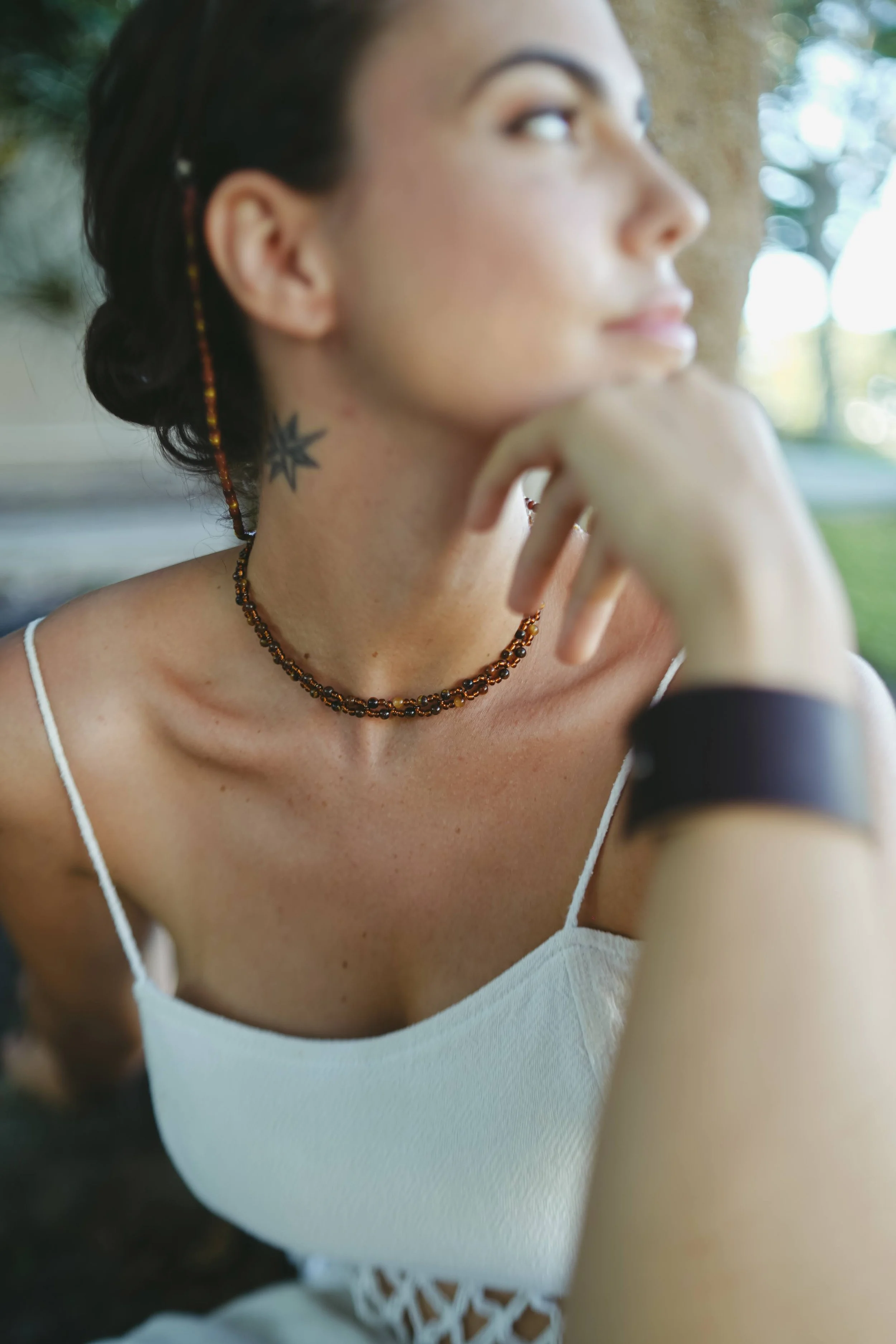 Bib-style multi-strand necklace with knotted cord. Features shells and combined bead appliqué. Lobster clasp closure. Bib-style multi-strand necklace with knotted cord. Features shells and combined bead appliqué. Lobster clasp closure.